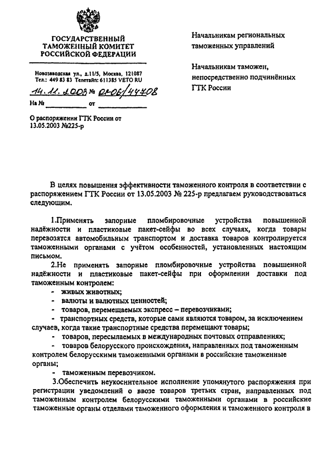 "О РАСПОРЯЖЕНИИ ГТК РОССИИ ОТ 13.05.2003 N 225-Р"