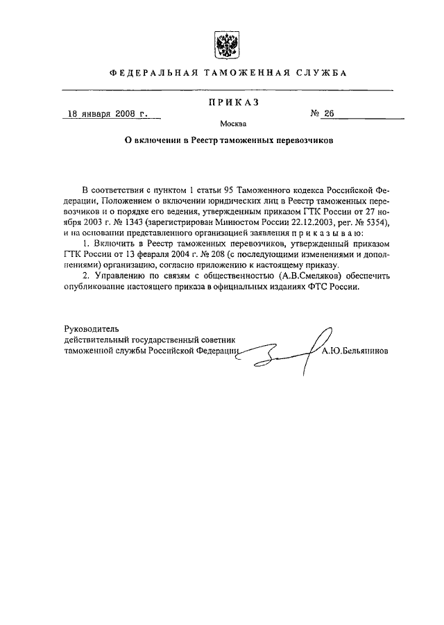 ПРИКАЗ ФТС РФ от 18.01.2008 N 26