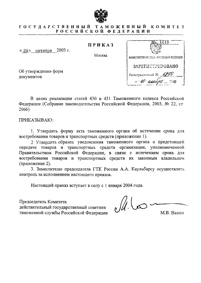 ПРИКАЗ ГТК РФ от 29.10.2003 N 1218