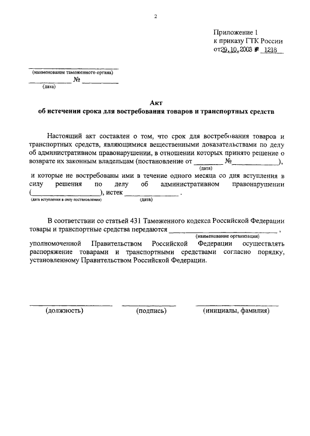 ПРИКАЗ ГТК РФ от 29.10.2003 N 1218