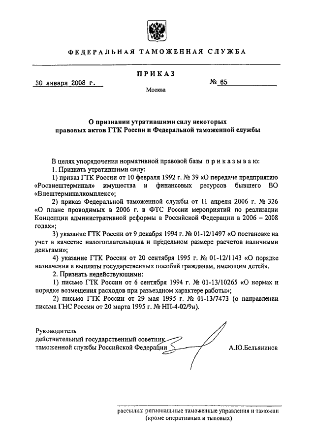 ПРИКАЗ ФТС РФ от 30.01.2008 N 65