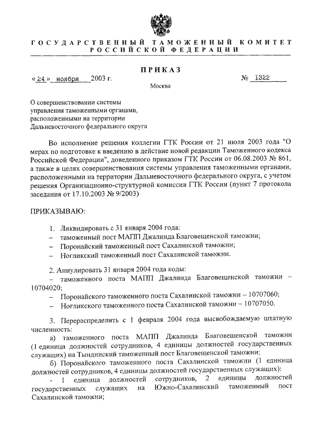 ПРИКАЗ ГТК РФ от 24.11.2003 N 1322