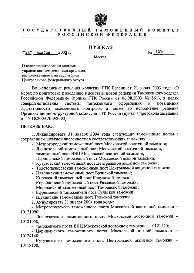 ПРИКАЗ ГТК РФ от 24.11.2003 N 1319