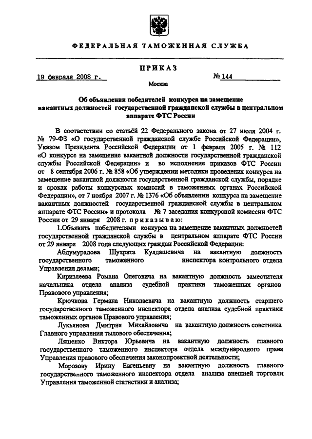 ПРИКАЗ ФТС РФ от 19.02.2008 N 144