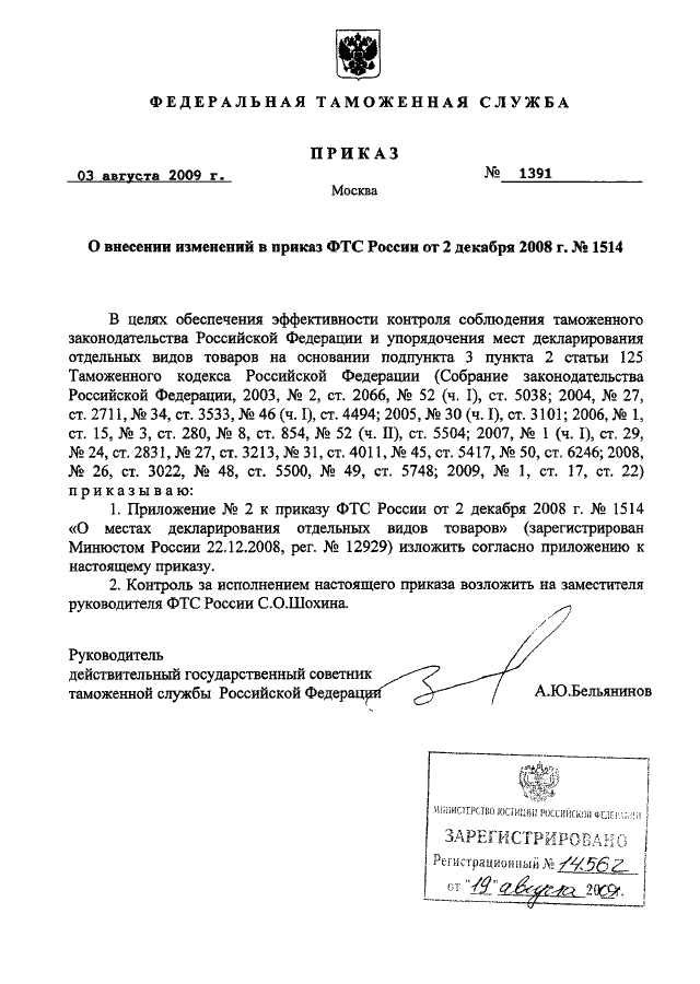 ПРИКАЗ ФТС РФ от 03.08.2009 N 1391