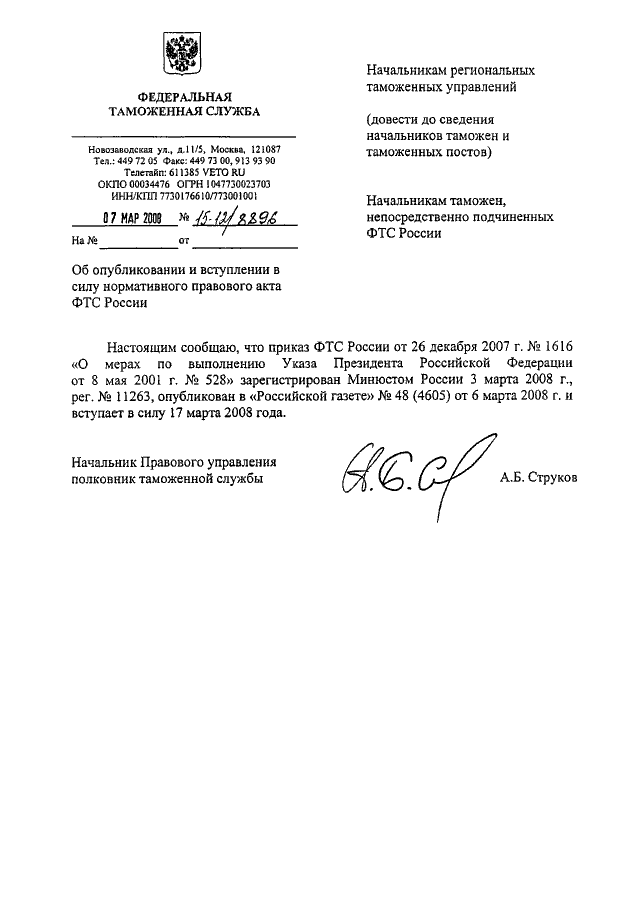 "ОБ ОПУБЛИКОВАНИИ И ВСТУПЛЕНИИ В СИЛУ НОРМАТИВНОГО ПРАВОВОГО АКТА ФТС РОССИИ"