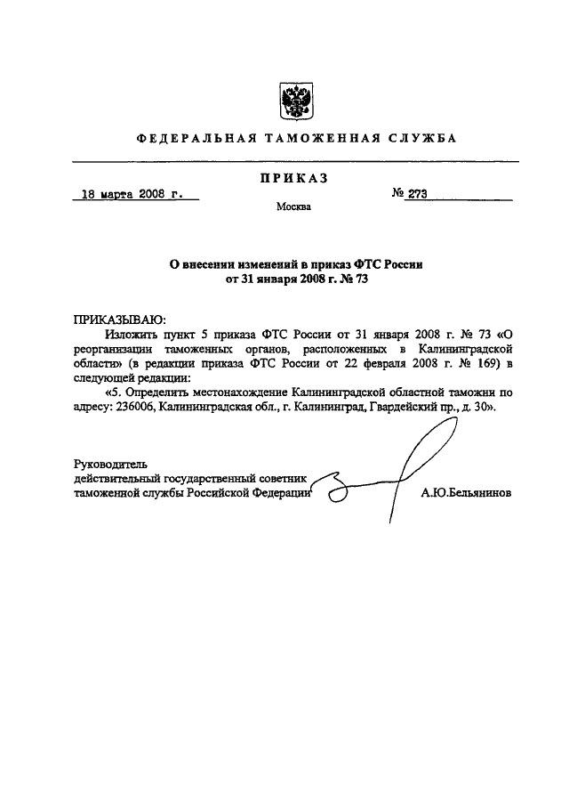 ПРИКАЗ ФТС РФ от 18.03.2008 N 273