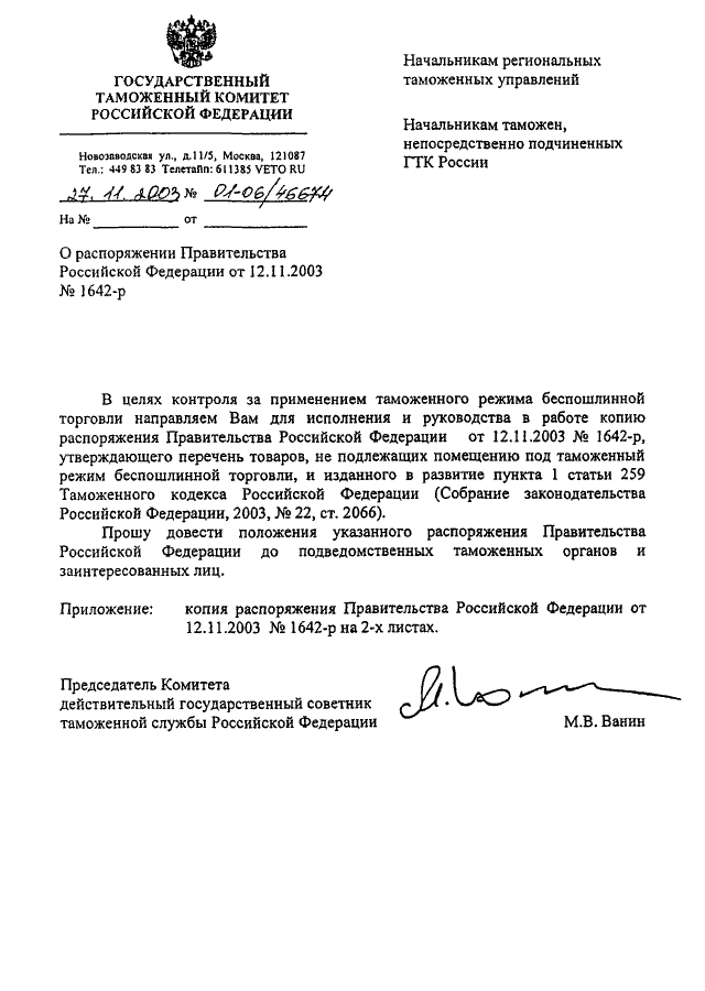 "О РАСПОРЯЖЕНИИ ПРАВИТЕЛЬСТВА РОССИЙСКОЙ ФЕДЕРАЦИИ ОТ 12.11.2003 N 1642-Р"