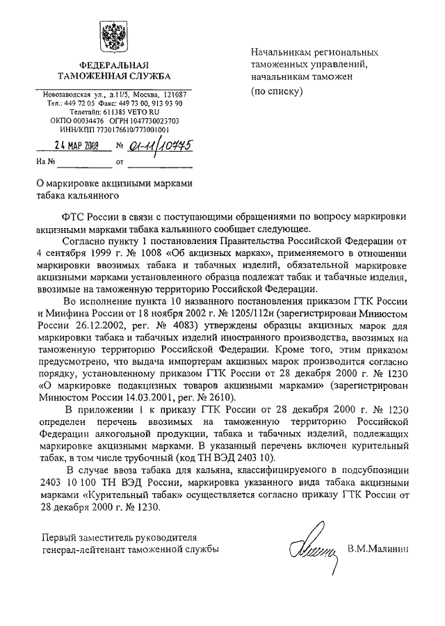 ПИСЬМО ФТС РФ от 24.03.2008 N 01-11/10775