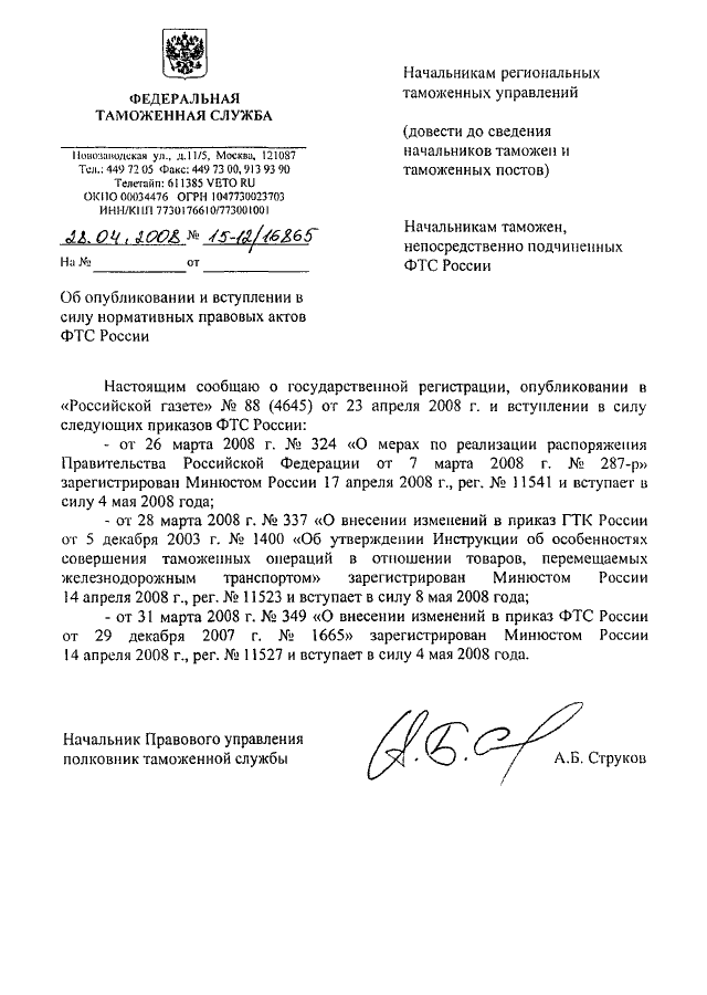 "ОБ ОПУБЛИКОВАНИИ И ВСТУПЛЕНИИ В СИЛУ НОРМАТИВНЫХ ПРАВОВЫХ АКТОВ ФТС РОССИИ"