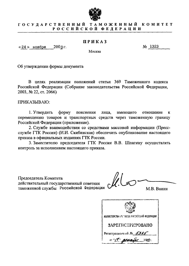 ПРИКАЗ ГТК РФ от 24.11.2003 N 1323