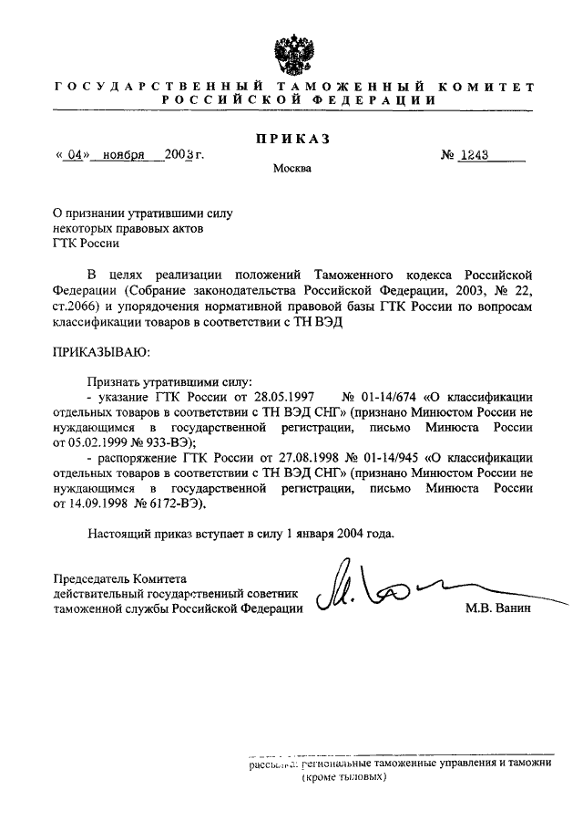 ПРИКАЗ ГТК РФ от 04.11.2003 N 1243