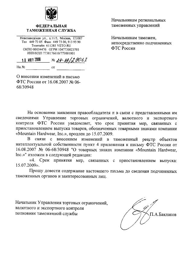 ПИСЬМО ФТС РФ от 18.07.2008 N 24-39/29063
