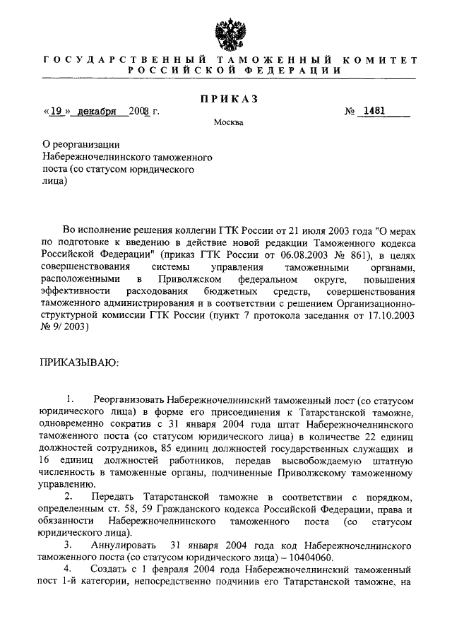 ПРИКАЗ ГТК РФ от 19.12.2003 N 1481