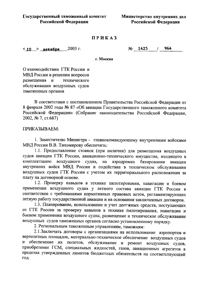 ПРИКАЗ ГТК РФ N 1425, МВД РФ N 964 от 10.12.2003