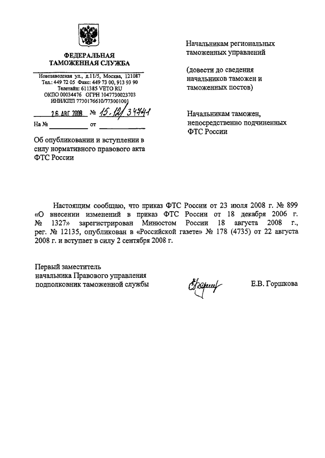 "ОБ ОПУБЛИКОВАНИИ И ВСТУПЛЕНИИ В СИЛУ НОРМАТИВНОГО ПРАВОВОГО АКТА ФТС РОССИИ"
