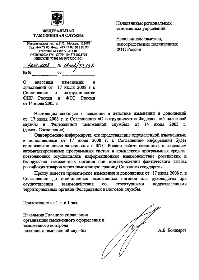 "О ВНЕСЕНИИ ИЗМЕНЕНИЙ И ДОПОЛНЕНИЙ ОТ 17 ИЮЛЯ 2008 Г. К СОГЛАШЕНИЮ О СОТРУДНИЧЕСТВЕ ФНС РОССИИ И ФТС РОССИИ ОТ 14 ИЮЛЯ 2005 Г."