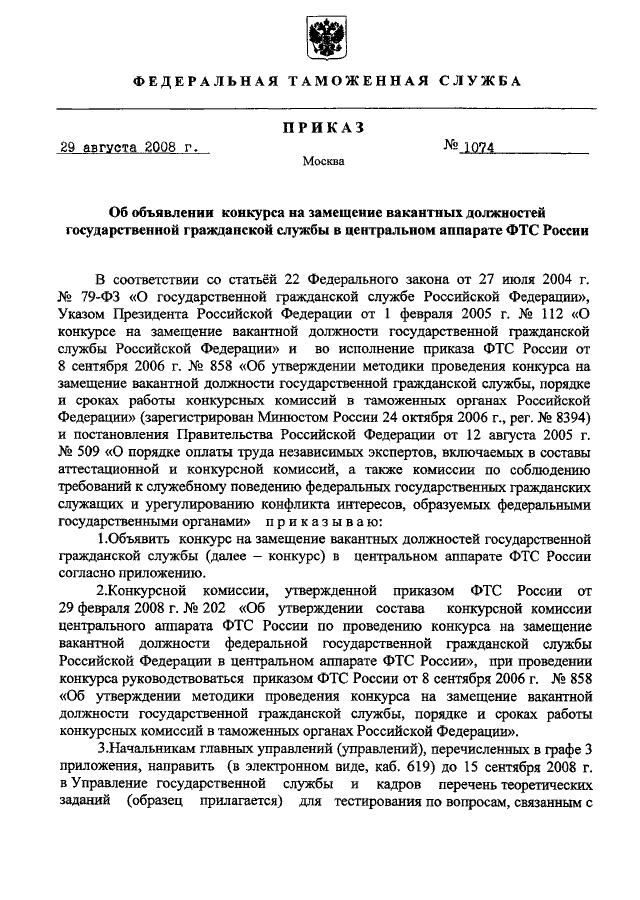 ПРИКАЗ ФТС РФ от 29.08.2008 N 1074