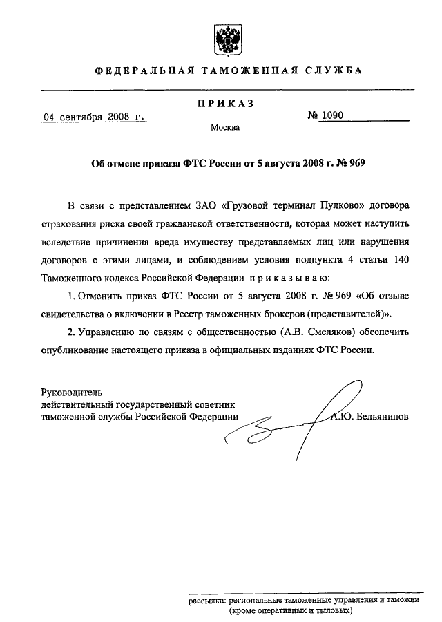 "ОБ ОТМЕНЕ ПРИКАЗА ФТС РОССИИ ОТ 5 АВГУСТА 2008 Г. N 969"