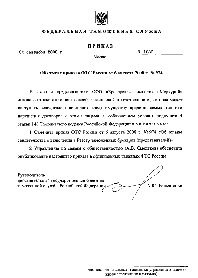 ПРИКАЗ ФТС РФ от 04.09.2008 N 1089