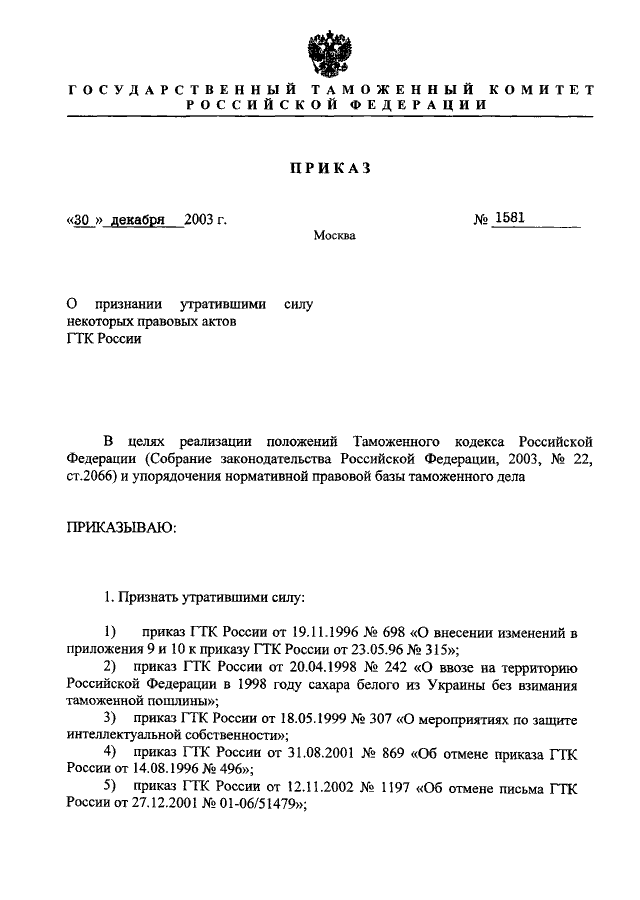 ПРИКАЗ ГТК РФ от 30.12.2003 N 1581