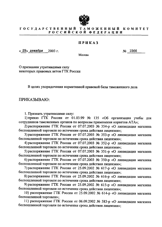 ПРИКАЗ ГТК РФ от 29.12.2003 N 1566