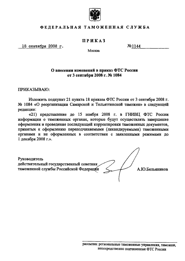 ПРИКАЗ ФТС РФ от 18.09.2008 N 1144