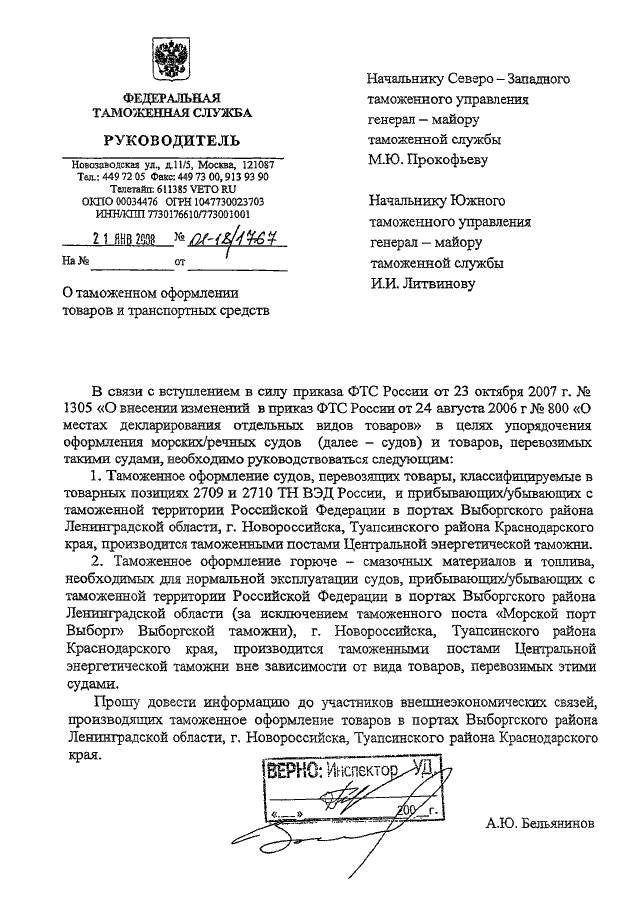 ПИСЬМО ФТС РФ от 21.01.2008 N 01-18/1767