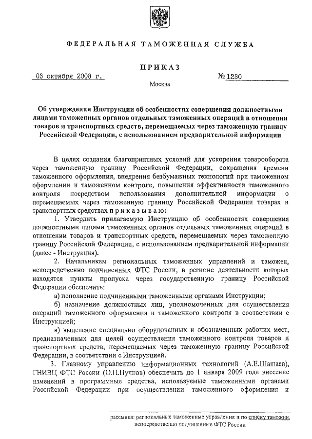 ПРИКАЗ ФТС РФ от 03.10.2008 N 1230 "ОБ УТВЕРЖДЕНИИ ИНСТРУКЦИИ ОБ ОСОБЕННОСТЯХ СОВЕРШЕНИЯ ДОЛЖНОСТНЫМИ
