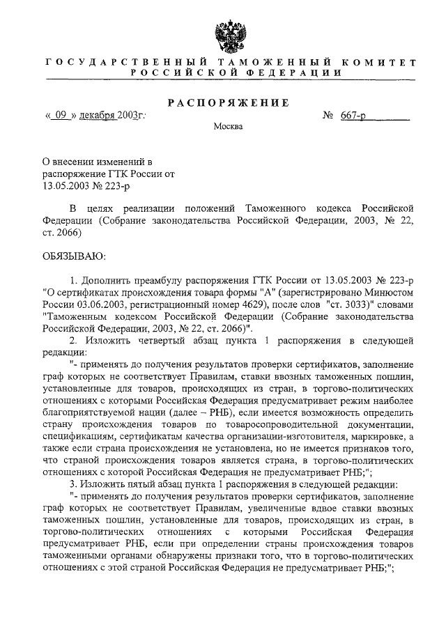 РАСПОРЯЖЕНИЕ ГТК РФ от 09.12.2003 N 667-р