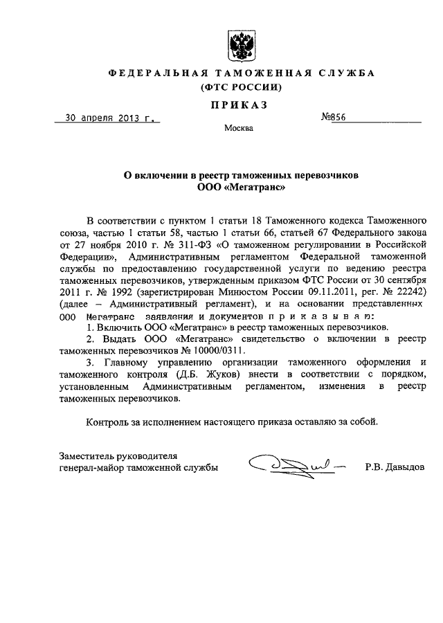 "О ВКЛЮЧЕНИИ В РЕЕСТР ТАМОЖЕННЫХ ПЕРЕВОЗЧИКОВ ООО "МЕГАТРАНС"