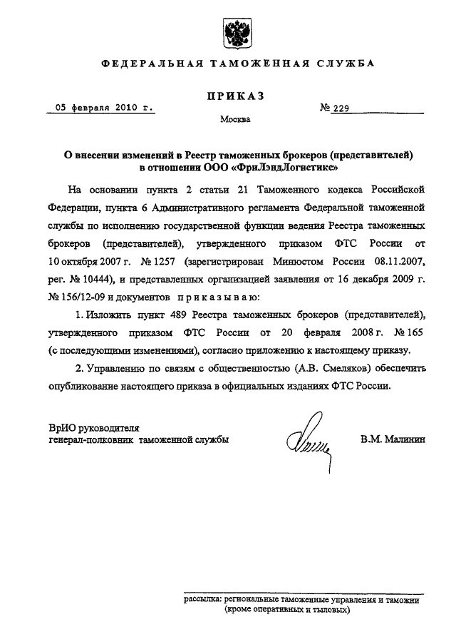 ПРИКАЗ ФТС РФ от 05.02.2010 N 229