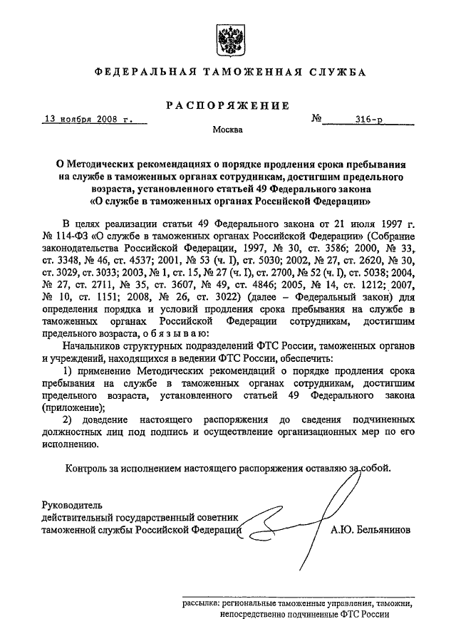 РАСПОРЯЖЕНИЕ ФТС РФ от 13.11.2008 N 316-р