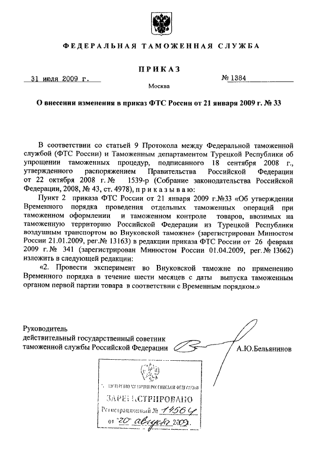 ПРИКАЗ ФТС РФ от 31.07.2009 N 1384
