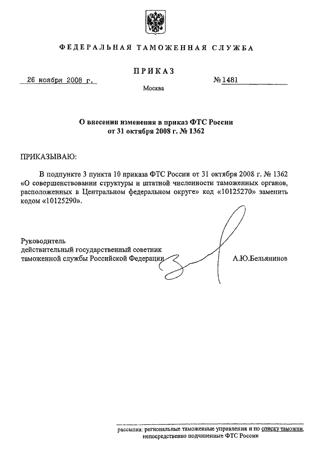 ПРИКАЗ ФТС РФ от 26.11.2008 N 1481