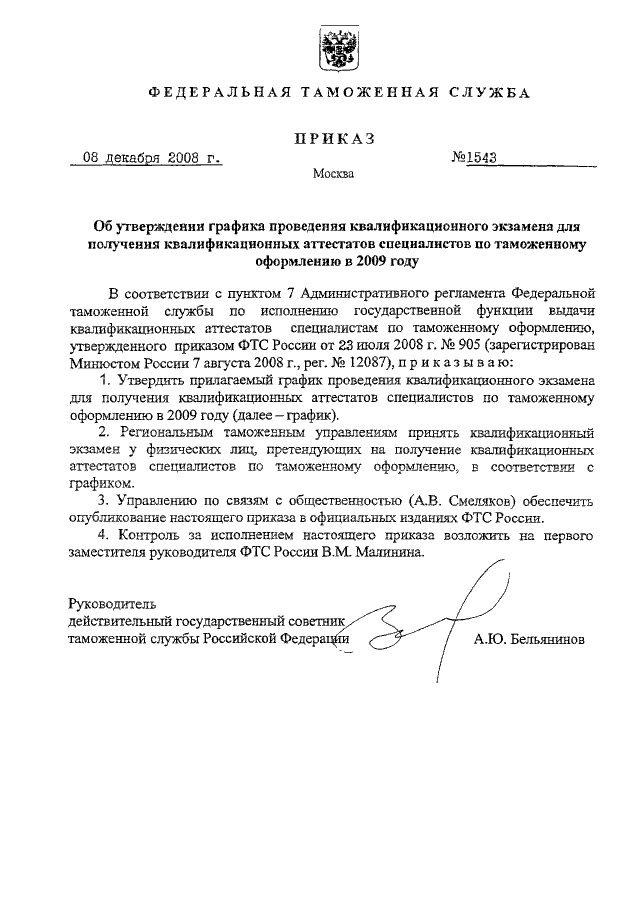 ПРИКАЗ ФТС РФ от 08.12.2008 N 1543
