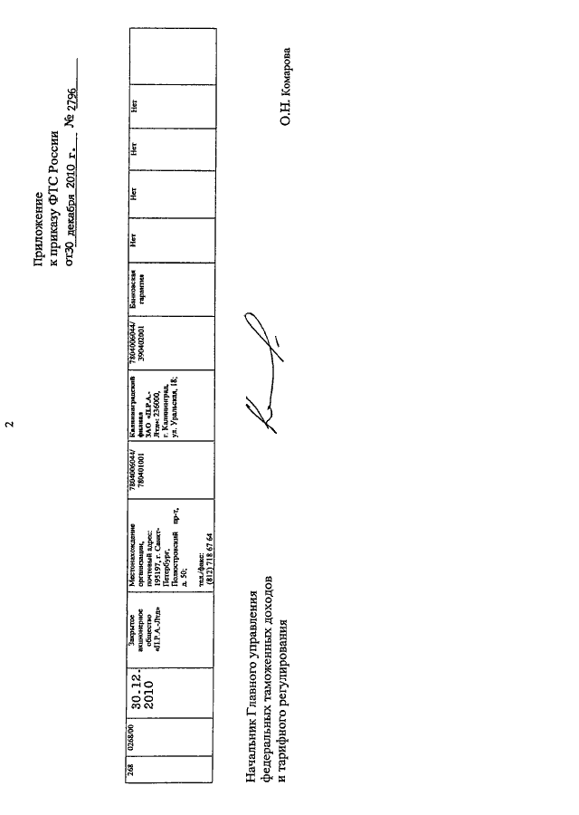 ПРИКАЗ ФТС РФ от 30.12.2010 N 2796