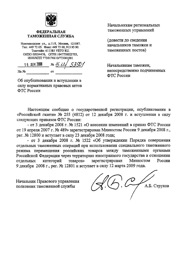 "ОБ ОПУБЛИКОВАНИИ И ВСТУПЛЕНИИ В СИЛУ НОРМАТИВНЫХ ПРАВОВЫХ АКТОВ ФТС РОССИИ"