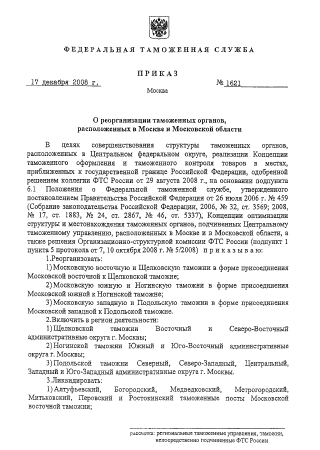 ПРИКАЗ ФТС РФ от 17.12.2008 N 1621