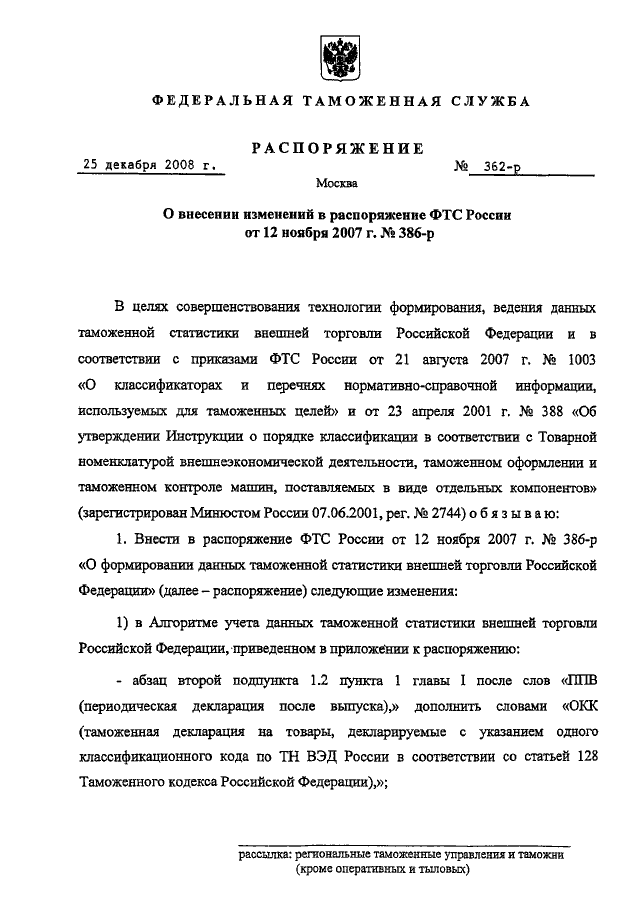РАСПОРЯЖЕНИЕ ФТС РФ от 25.12.2008 N 362-р