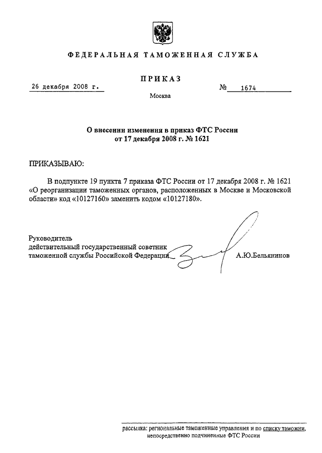ПРИКАЗ ФТС РФ от 26.12.2008 N 1674