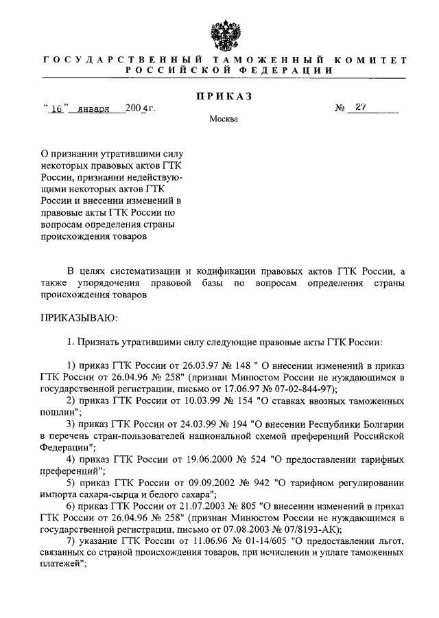 ПРИКАЗ ГТК РФ от 16.01.2004 N 27 "О ПРИЗНАНИИ УТРАТИВШИМИ СИЛУ НЕКОТОРЫХ ПРАВОВЫХ АКТОВ ГТК РОССИИ,