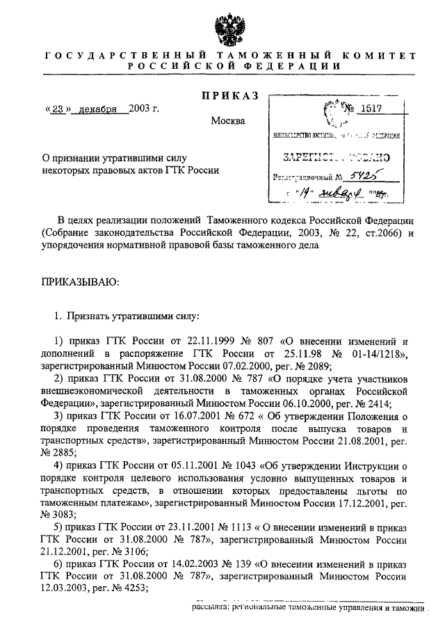 ПРИКАЗ ГТК РФ от 23.12.2003 N 1517