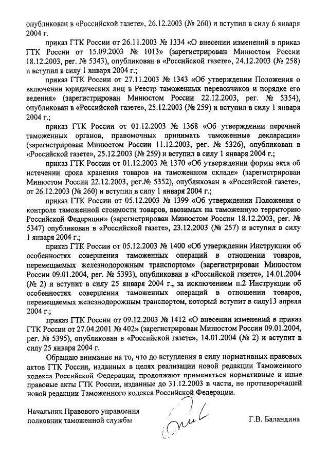 "О ВСТУПЛЕНИИ В СИЛУ НОРМАТИВНЫХ ПРАВОВЫХ АКТОВ ГТК РОССИИ, ИЗДАННЫХ В ЦЕЛЯХ РЕАЛИЗАЦИИ ТАМОЖЕННОГО КОДЕКСА РОССИЙСКОЙ ФЕДЕРАЦИИ, (СОБРАНИЕ ЗАКОНОДАТЕЛЬСТВА РОССИЙСКОЙ ФЕДЕРАЦИИ, 2003, N 22, СТ. 2066; N 52, СТ. 5038)"