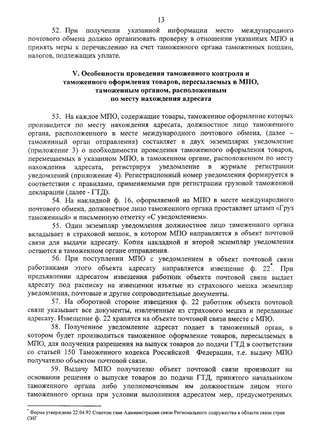 "ОБ УТВЕРЖДЕНИИ ПРАВИЛ ТАМОЖЕННОГО ОФОРМЛЕНИЯ И ТАМОЖЕННОГО КОНТРОЛЯ ТОВАРОВ, ПЕРЕСЫЛАЕМЫХ ЧЕРЕЗ ТАМОЖЕННУЮ ГРАНИЦУ РОССИЙСКОЙ ФЕДЕРАЦИИ В МЕЖДУНАРОДНЫХ ПОЧТОВЫХ ОТПРАВЛЕНИЯХ"